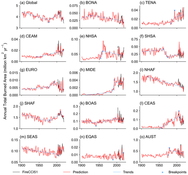 The reconstruction reveals century-long global fire patterns. Global burned area decreased from 1901 to 1978, followed by a significant increase from 1978 to 2008, and then a sharp decline from 2008 to 2020 – the steepest change of the entire period.